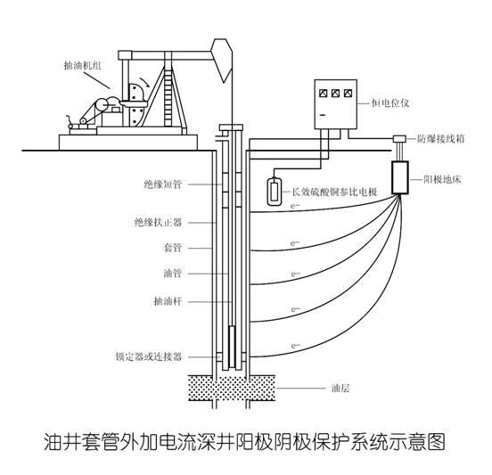油井套管陰極保護(hù),是在油井較密集或油井相對(duì)集中的區(qū)域,平均每2-4口油井打一口陽極深井,作為陰極保護(hù)系統(tǒng)的陽極,通過恒電位儀施加強(qiáng)制電流,為套管提供均勻、足量的陰極保護(hù)電流,然后通過井口附近的匯流點(diǎn)流回恒電位儀的陰極,構(gòu)成閉合回路,使油井套管充分陰極極化,從而避免或減輕油井套管的腐蝕。