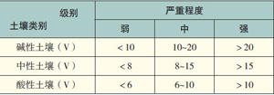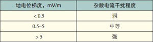 另外,土壤中若存在大量雜散電流,必然會(huì)引起大地電位梯度的變化。因此,可根據(jù)地電位梯度來(lái)判定土壤中是否存在雜散電流及其嚴(yán)重程度,并據(jù)此推斷管道受干擾的可能性。地電位梯度與雜散電流干擾強(qiáng)度的關(guān)系見(jiàn)表2。
