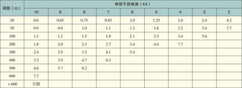 當(dāng)電氣化鐵路與埋地管道近距離平行時(shí),必須增加排流防護(hù)措施。其中,德國(guó)標(biāo)準(zhǔn)給出了涂敷良好的管道與50HZ電氣化鐵路平行時(shí)的限制長(zhǎng)度,它是平行間距和干擾電流的函數(shù)。如表4所示。